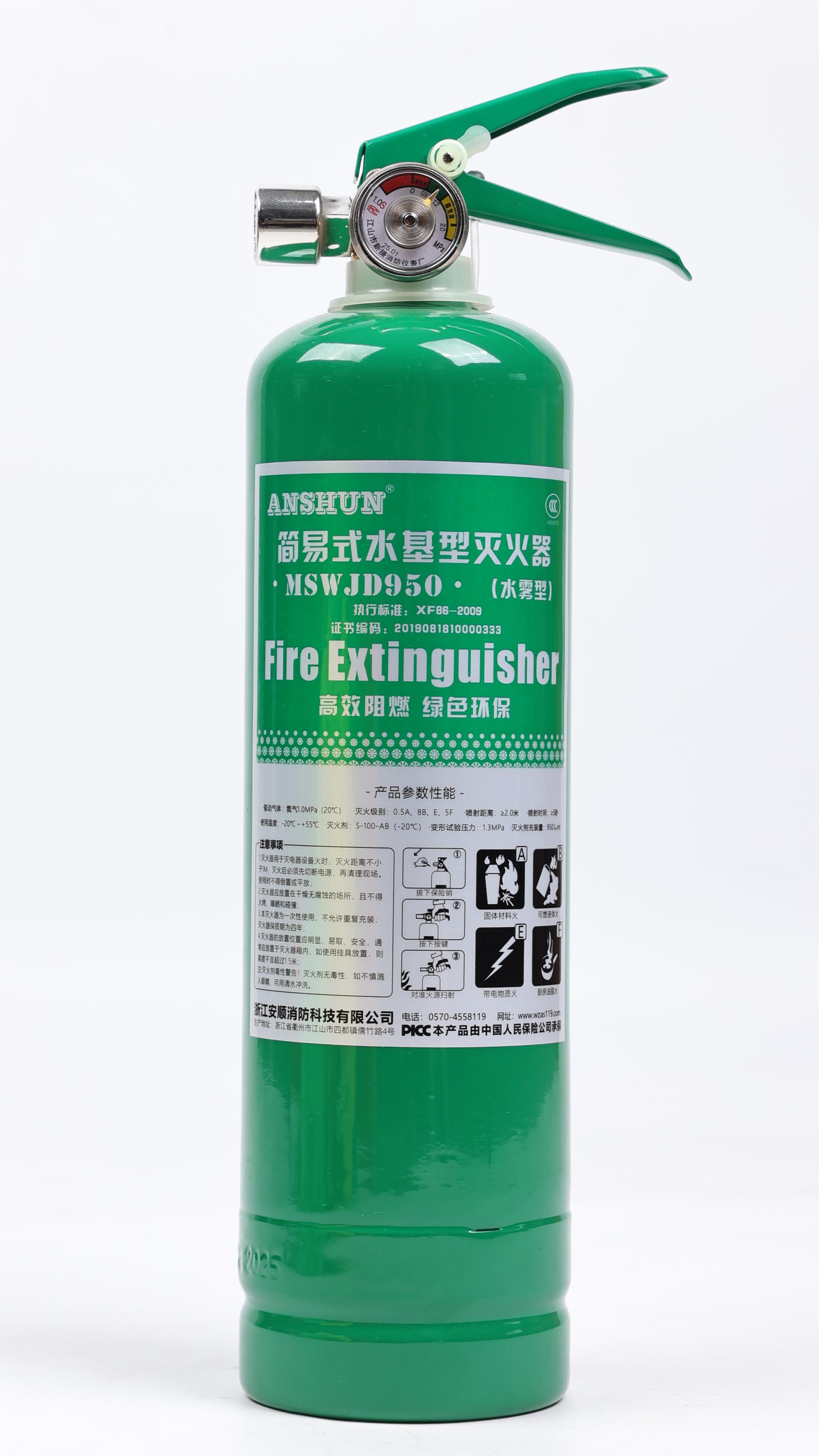 手提式水基型灭火器使用时,应手提灭火器提把,迅速奔到燃烧处。然后迅速拔出保险销,按下压把,此时泡沫即可喷出。泡沫喷出后,应对准燃烧最猛烈处喷射;灭火时,应随着喷射距离的缩减,使用者逐渐向燃烧处靠近,并始终让泡沫喷射在燃烧物上,直至将火扑灭。灭火器在使用时,一定要将灭火器保持直立状态,直至喷射完毕。