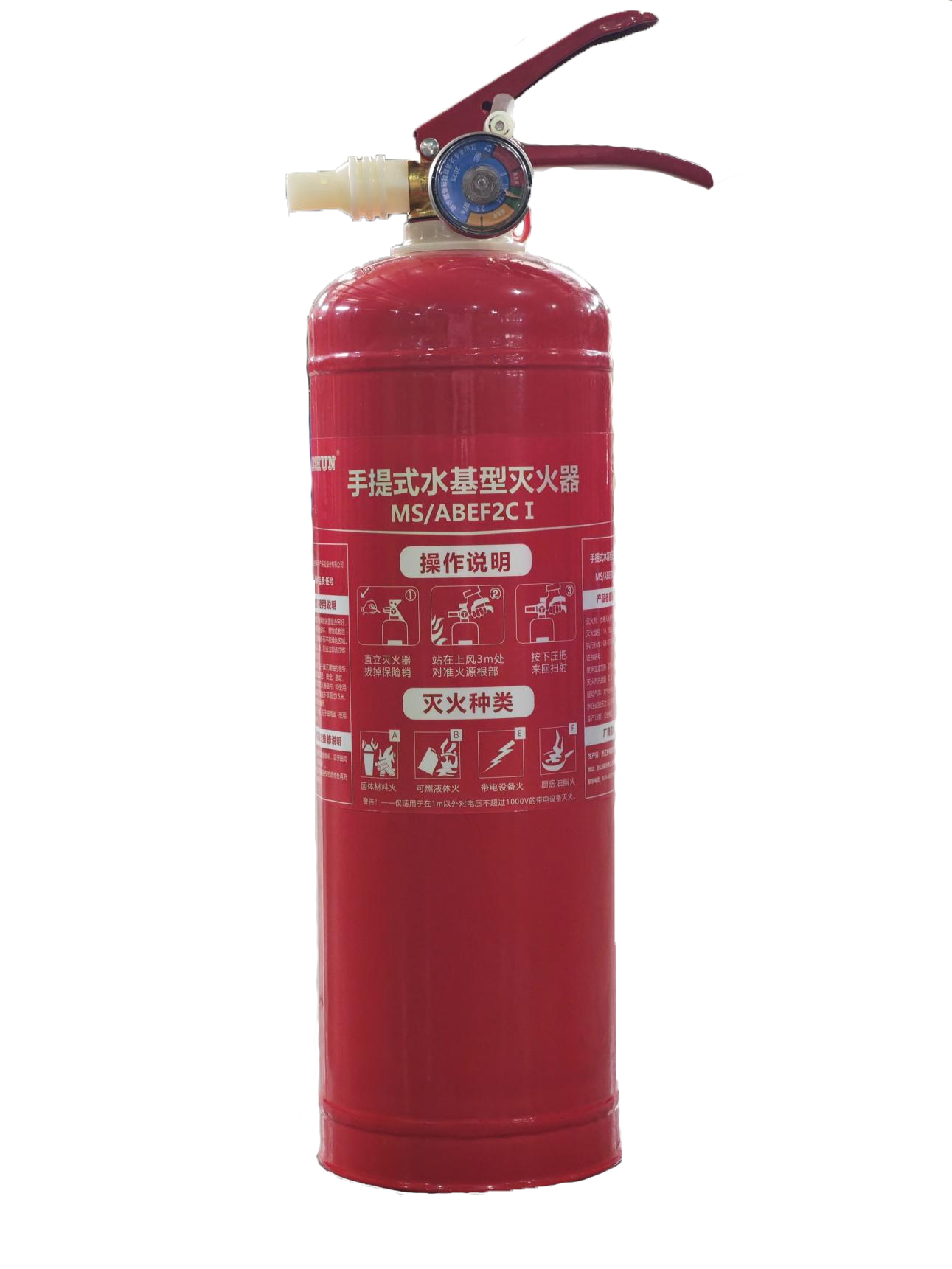 手提式水基型灭火器使用时,应手提灭火器提把,迅速奔到燃烧处。然后迅速拔出保险销,按下压把,此时泡沫即可喷出。泡沫喷出后,应对准燃烧最猛烈处喷射;灭火时,应随着喷射距离的缩减,使用者逐渐向燃烧处靠近,并始终让泡沫喷射在燃烧物上,直至将火扑灭。灭火器在使用时,一定要将灭火器保持直立状态,直至喷射完毕。